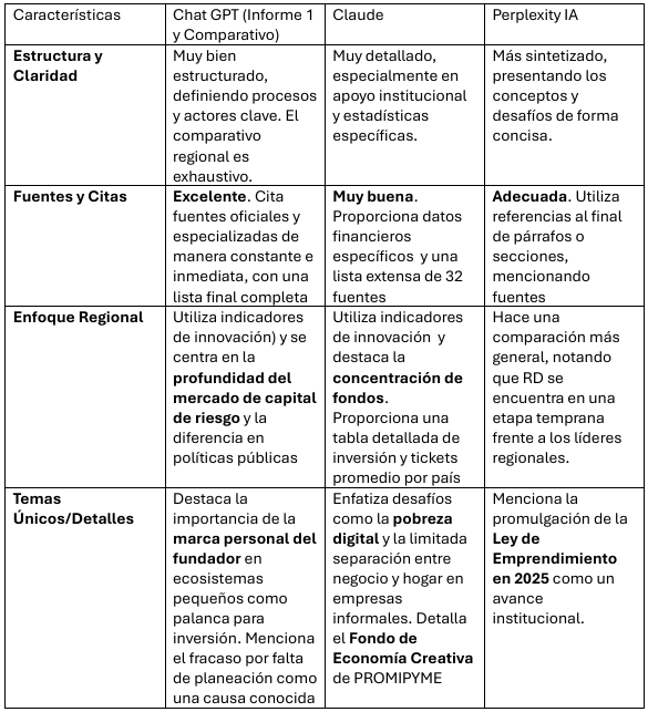 La respuesta de Chat GPT (tanto en el informe local como en el comparativo) fue la más analítica respecto a la estrategia, enfocándose en cómo las startups dominicanas deben compensar el mercado pequeño buscando internacionalización temprana y usando la marca personal como apalancamiento.